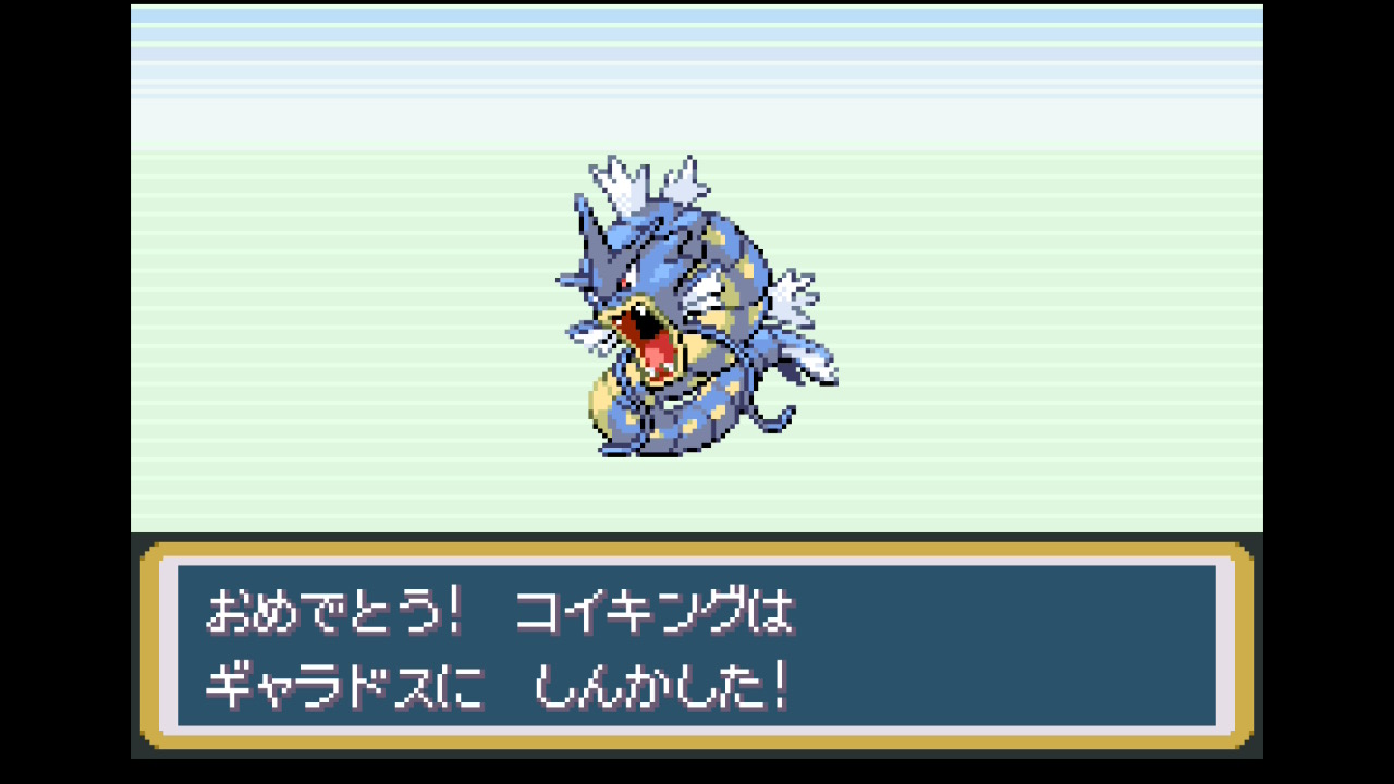 コイキングがギャラドスに進化したー!!やったよ〜!!!かみつくを覚えたので戦闘でも活躍してくれるようになりました。まだ水技は覚えてくれません。レベルアップでなにかしら覚えてくれる…よな…………???