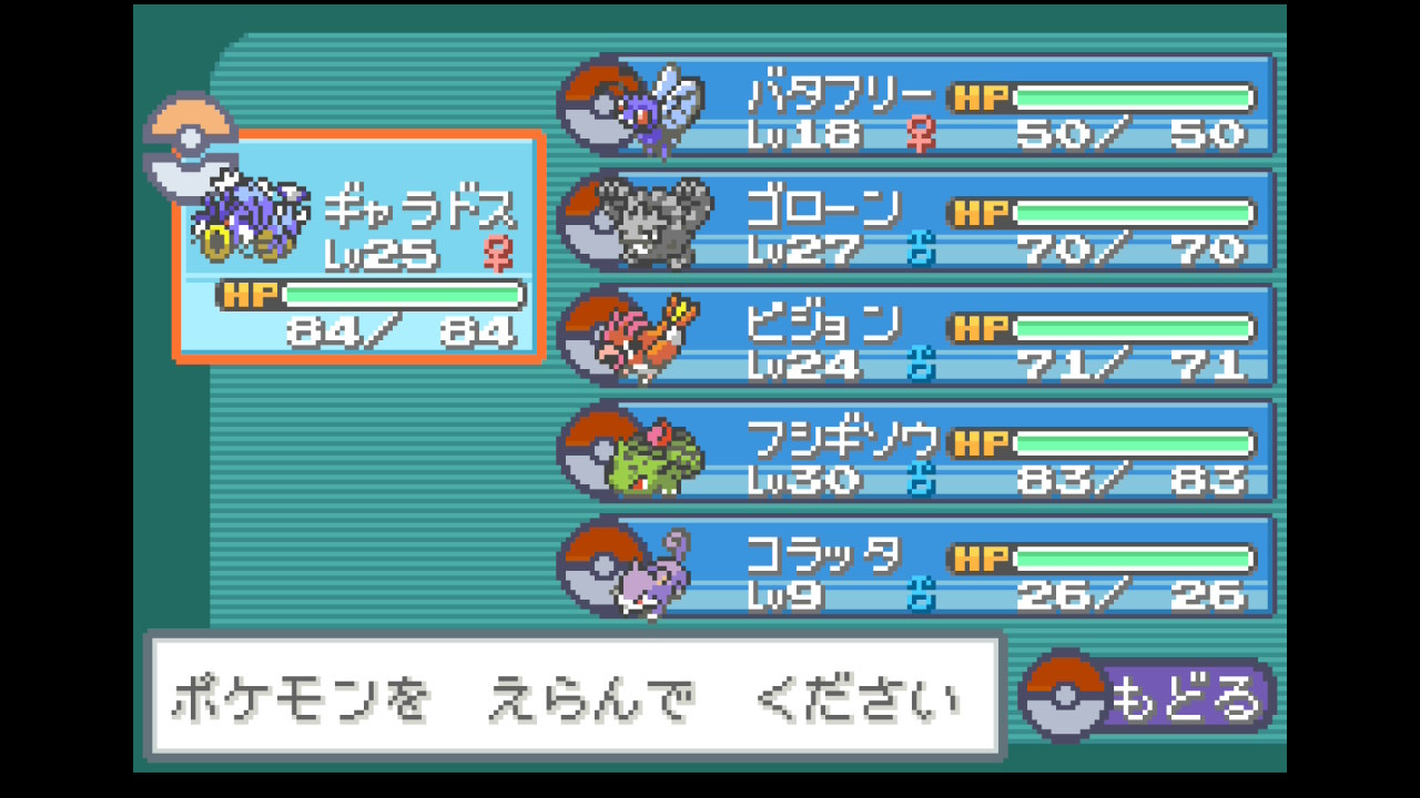 現在のパーティ構成のスクショ撮るの忘れた!ちょっとずつレベルは上がってますがギャラドスに進化した以外は前回までと同じです。